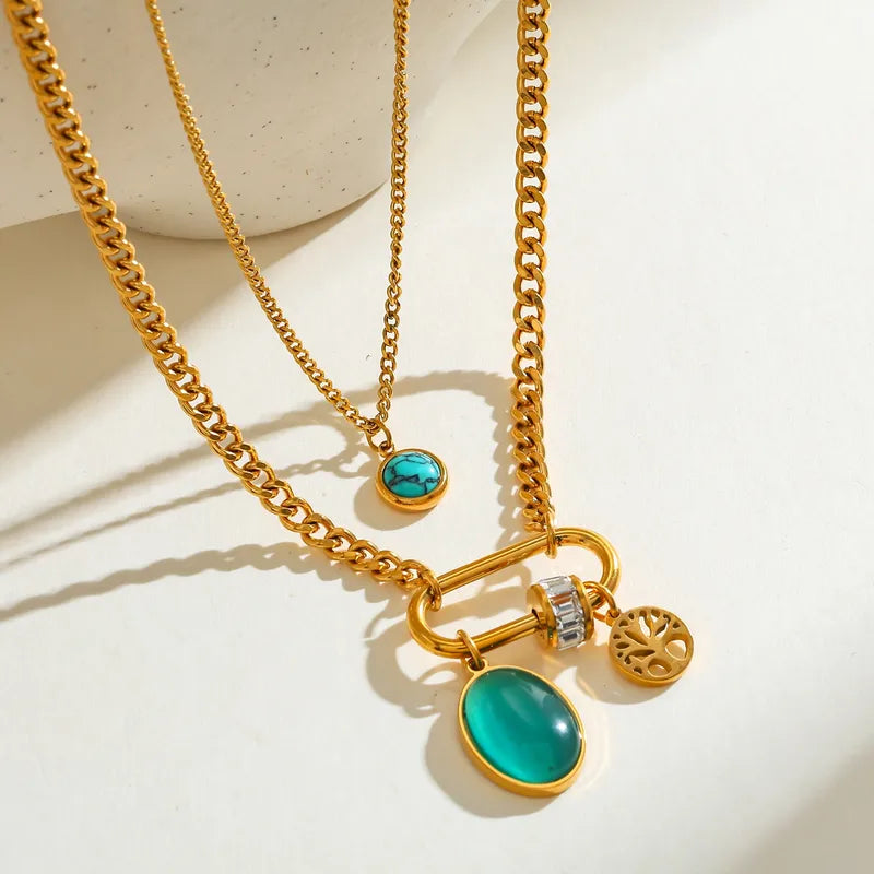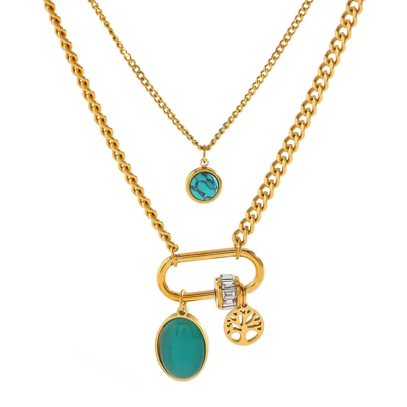 Κολιέ επιχρυσωμένο ατσάλι διπλό με τιρκουάζ-NE448