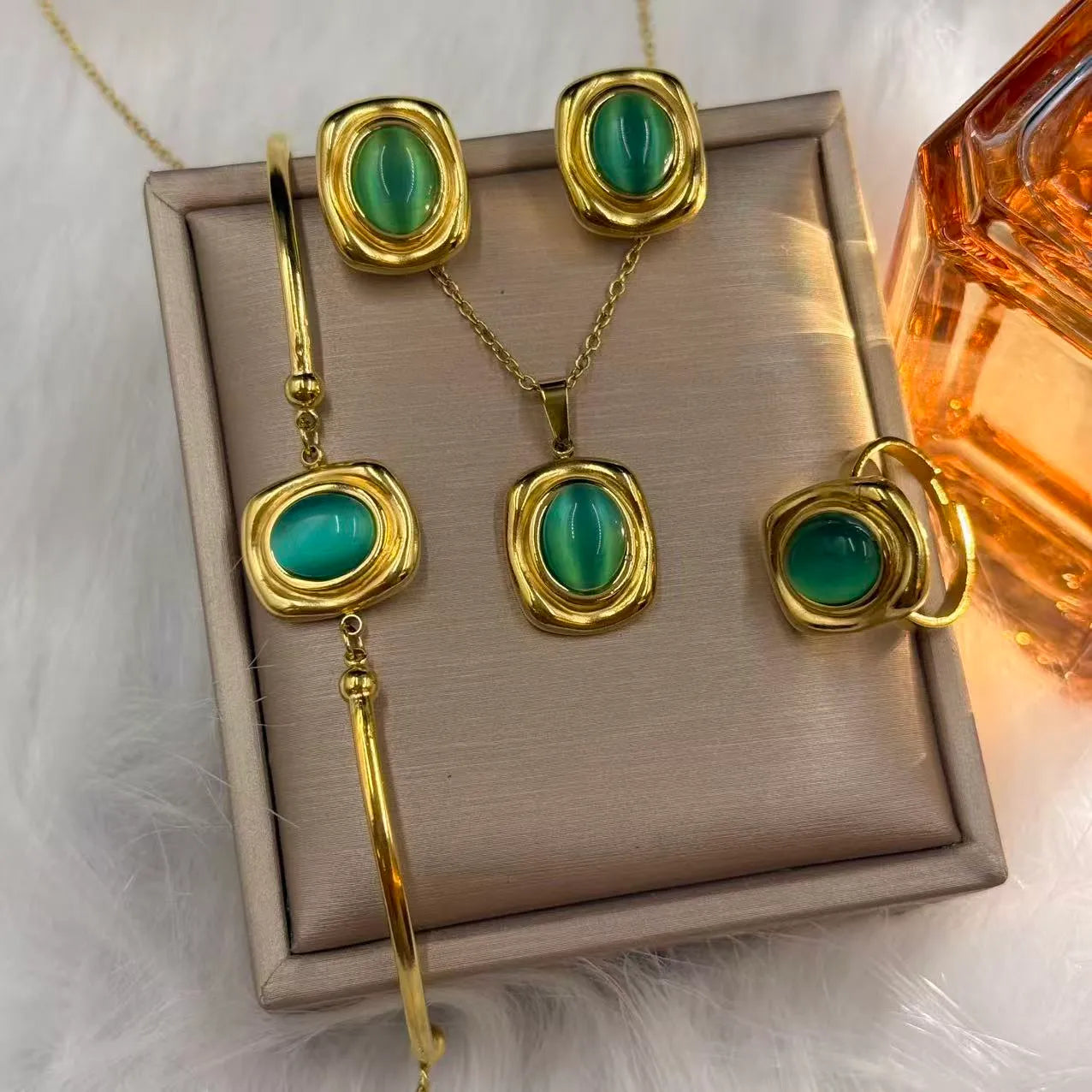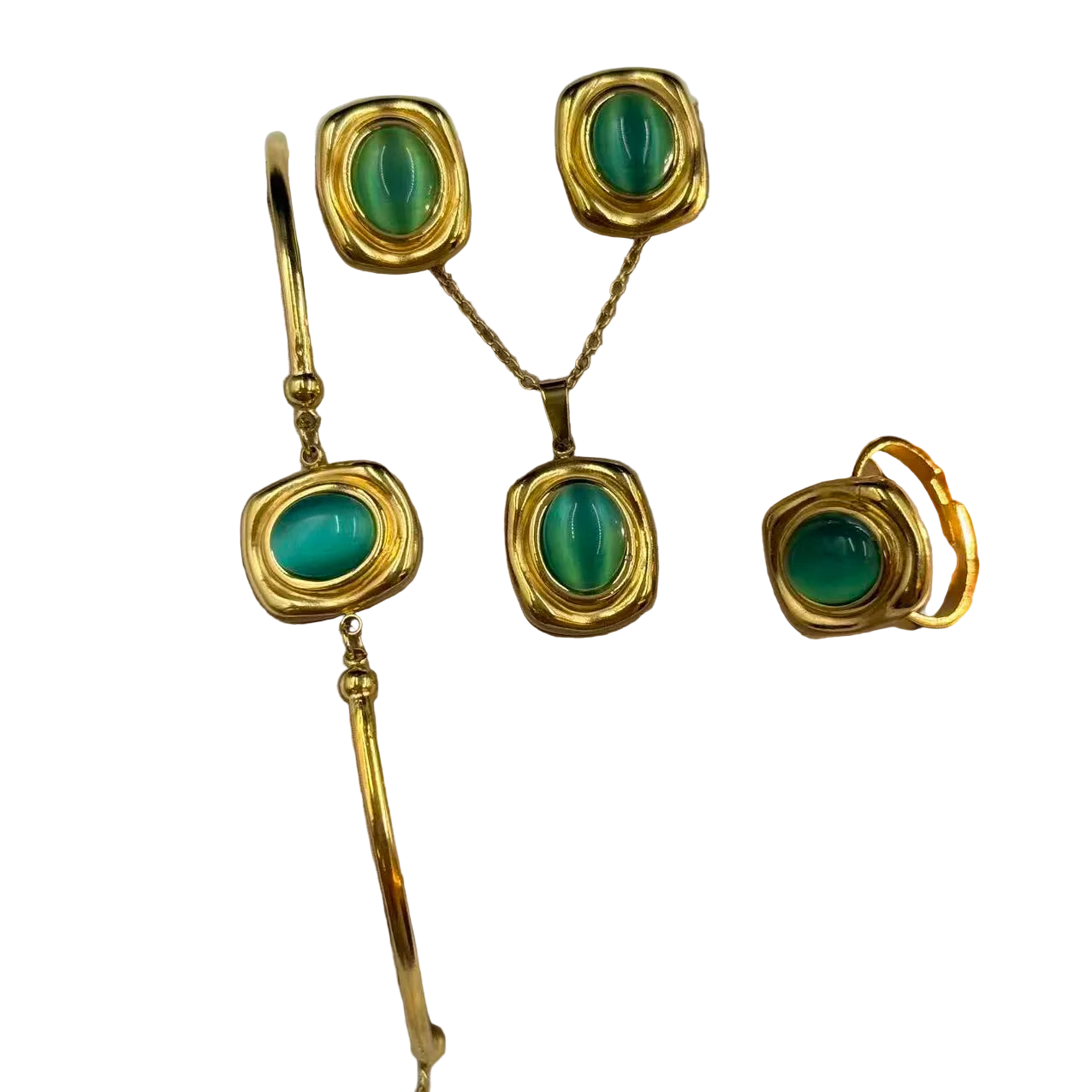 Σετ ατσάλι κολιέ σκουλαρίκια βραχιόλι και δαχτυλίδι με πράσινη πέτρα-SET068