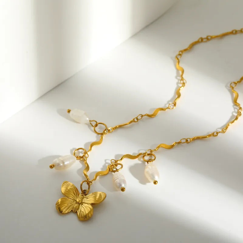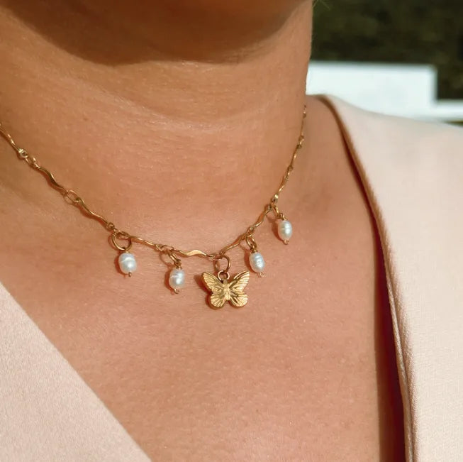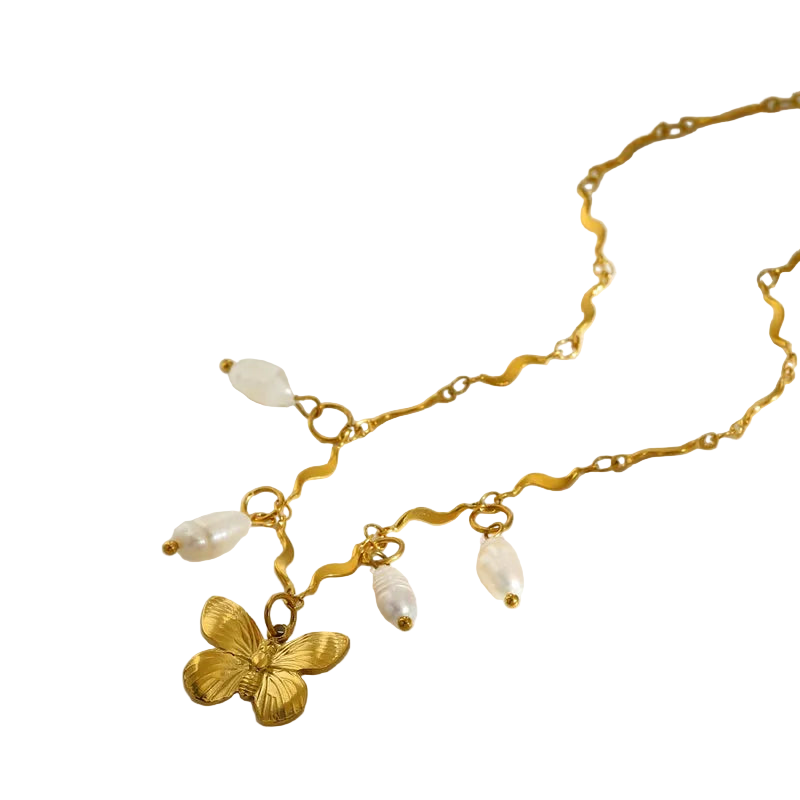 *Κολιέ επιχρυσωμένο ατσάλι με πεταλούδα και περλίτσες-NE198