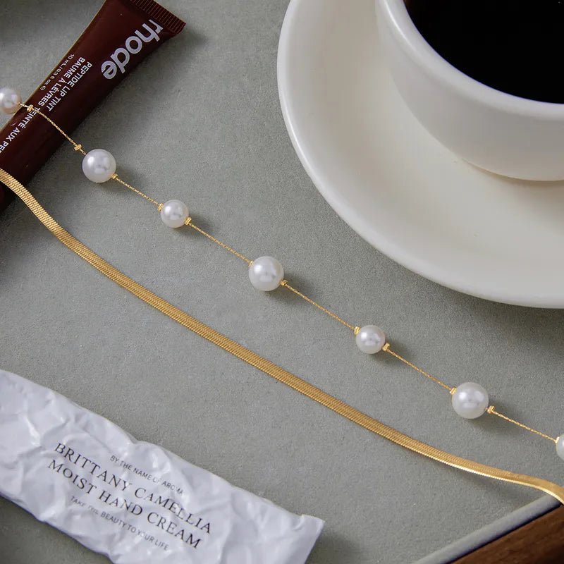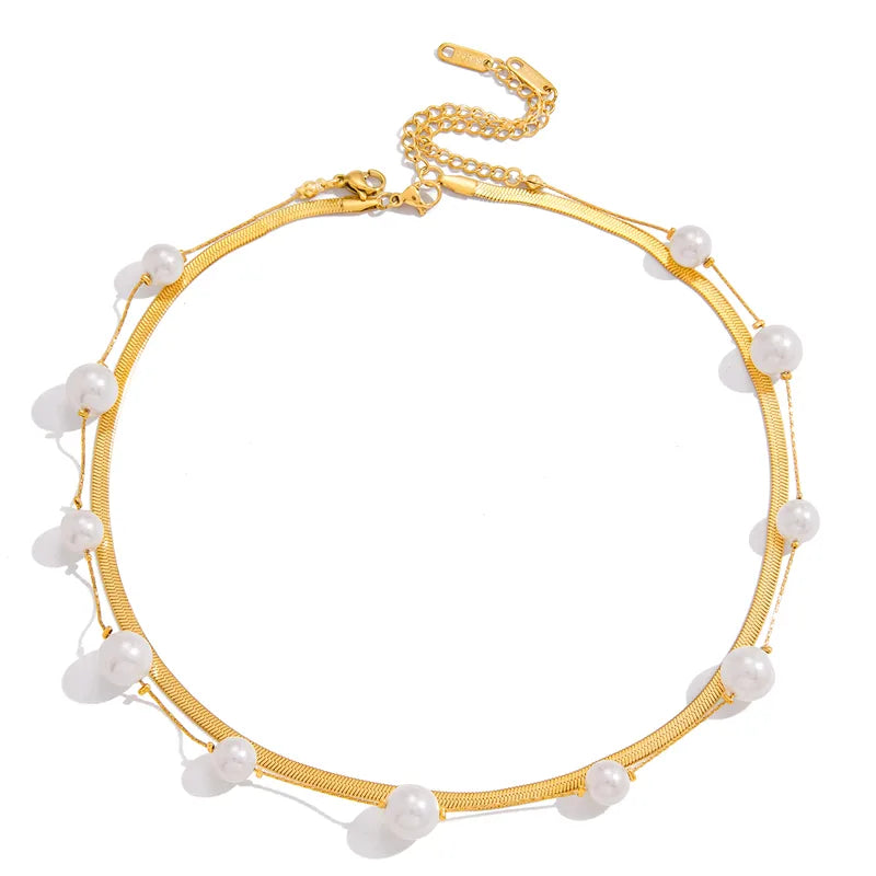 Colier cu lant dublu din otel placat cu aur cu perle-NE168