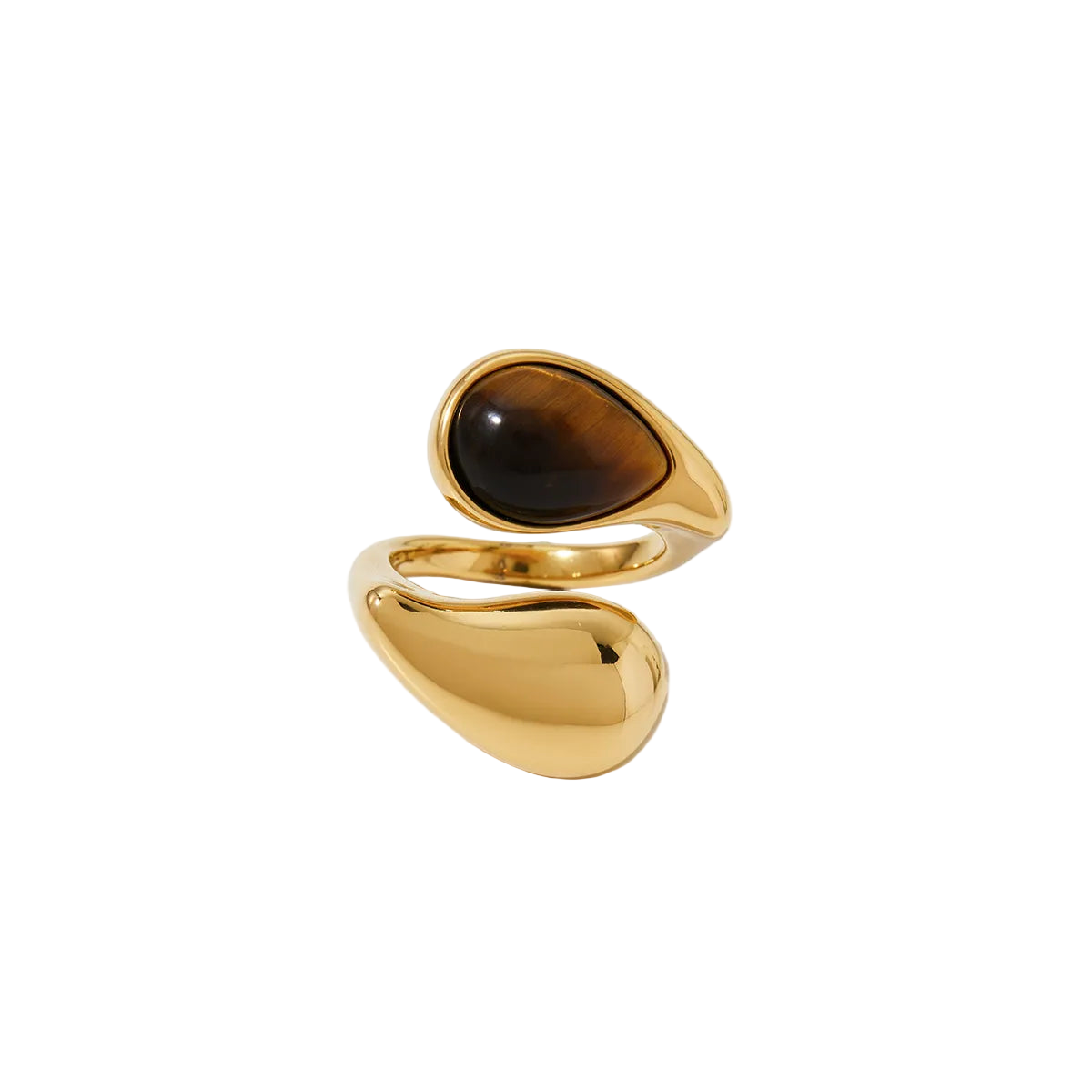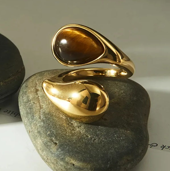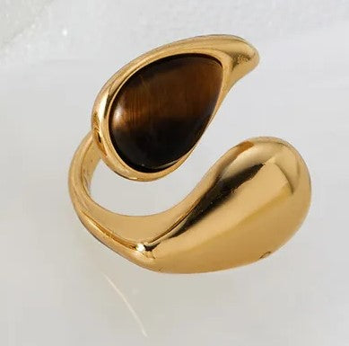 Inel din oțel auriu cu piatră de tigru maro-R253